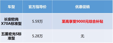 目前,我們從兩家車企的官方網(wǎng)站了解到,購買五菱宏光S無任何促銷政策,廠商指導(dǎo)價(jià)為即經(jīng)銷商銷售價(jià)格;長安歐尚汽車方面,為響應(yīng)國家“汽車下鄉(xiāng)”政策,現(xiàn)購買長安歐尚X70A至高可以享受9000元綜合補(bǔ)貼!原價(jià)5.59萬的長安歐尚X70A標(biāo)準(zhǔn)型,僅需4萬多就可以買到,購入價(jià)遠(yuǎn)低于五菱宏光S標(biāo)準(zhǔn)型5.28萬的售價(jià)。