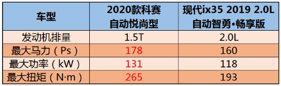 如果以現(xiàn)代ix35的動(dòng)力水平為標(biāo)準(zhǔn)的話,那2020款科賽的動(dòng)力裝配有點(diǎn)“越級(jí)”了,通過(guò)比較考驗(yàn)看出,2020款科賽搭載的這款長(zhǎng)安藍(lán)鯨1.5T發(fā)動(dòng)機(jī),最大馬力為178Ps,最大功率為131kW,最大扭矩265N·m,動(dòng)力輸出更強(qiáng)勁。另外,配合愛(ài)信6AT變速箱,動(dòng)力操控很值得期待,要知道,愛(ài)信6AT變速箱擁有技術(shù)成熟、質(zhì)量穩(wěn)定和大批量產(chǎn)出的成本優(yōu)勢(shì),調(diào)校舒適,可在瞬間完成升擋降擋,讓駕駛變得更順暢。