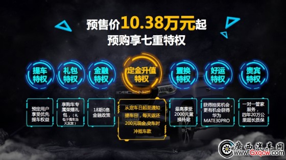 第一重特權(quán)為“定金升值特權(quán)”即從定車日起至通知提車日,每天返還200元現(xiàn)金,交車時(shí)沖抵車款;第二重“金融特權(quán)”:18期0息金融政策;第三重“置換特權(quán)”:最高享受2000元置換補(bǔ)貼;第四重“禮包特權(quán)”:享購車專屬榮耀禮包,禮包于提車當(dāng)天發(fā)放;第五重“好運(yùn)特權(quán)”:獲得抽獎(jiǎng)機(jī)會(huì),更有機(jī)會(huì)獲得華為MATE 30 PRO;第六重“提車特權(quán)”:預(yù)定用戶享受優(yōu)先提車權(quán)益;第七重“貴賓特權(quán)”:一對(duì)一管家服務(wù)及4年20萬公里超長質(zhì)保。