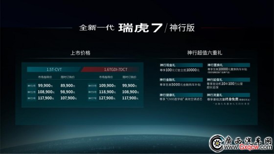 此次新車發(fā)布包括1.6T+7DCT和1.5T+CVT兩種動力組合,共6款車型,官方指導價為9.99-12.79萬元。11月30日前100元訂金立抵10000元,1.5T神行版車型限時訂購價低至8.99萬元起,1.6T神行版車型限時訂購價低至9.99萬元起! 為了向廣大消費者提供更高質(zhì)價比的駕享體驗,奇瑞汽車特推出神行超值六重禮(神行金融禮、神行置換禮、神行延保禮等多重禮遇)。