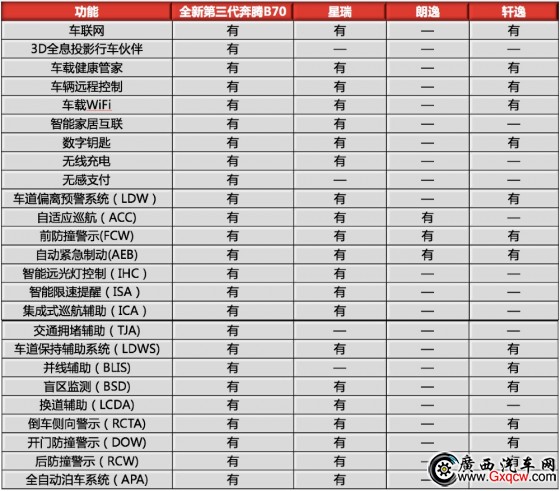 我們從上表中的對(duì)比中不難發(fā)現(xiàn),全新第三代奔騰B70與星瑞在智能科技方面,緊跟智能化浪潮,做到“讓汽車(chē)能聽(tīng)會(huì)說(shuō),能理解會(huì)思考”,及讓自身成為無(wú)處不在的“貼身保鏢”。顯然,這種表現(xiàn)與朗逸、軒逸,形成了鮮明的高下立判。在這項(xiàng)環(huán)節(jié)PK中,表現(xiàn)最差強(qiáng)人意的當(dāng)屬朗逸,不管智能網(wǎng)聯(lián)或智能駕駛功能,豐富性均不及另外三款車(chē)型,難談“智”價(jià)比。