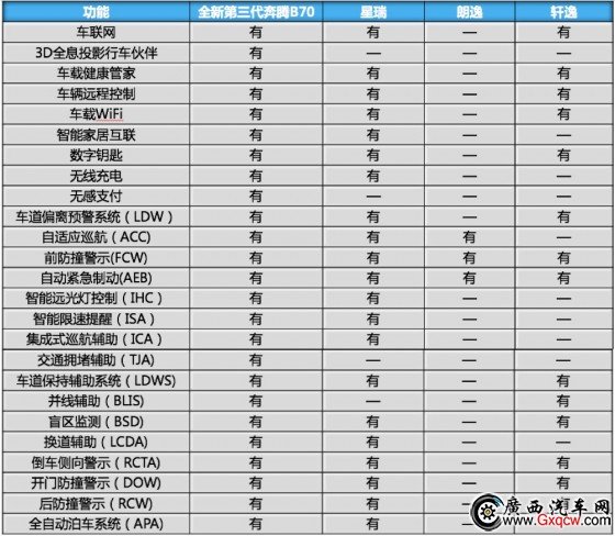 我們從上表中的對(duì)比中不難發(fā)現(xiàn),全新第三代奔騰B70與星瑞在智能科技方面,緊跟智能化浪潮,做到“讓汽車(chē)能聽(tīng)會(huì)說(shuō),能理解會(huì)思考”,及讓自身成為無(wú)處不在的“貼身保鏢”。顯然,這種表現(xiàn)與朗逸、軒逸,形成了鮮明的高下立判。在這項(xiàng)環(huán)節(jié)PK中,表現(xiàn)最差強(qiáng)人意的當(dāng)屬朗逸,不管智能網(wǎng)聯(lián)或智能駕駛功能,豐富性均不及另外三款車(chē)型,難談“智”價(jià)比。