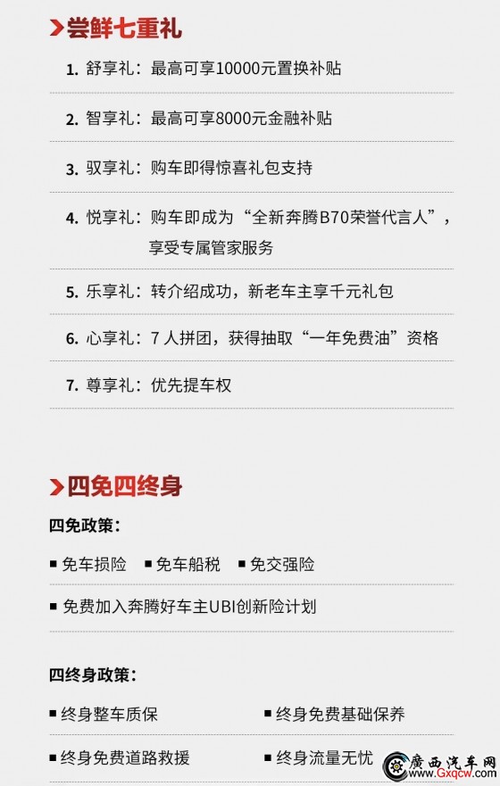 買(mǎi)車(chē)上,至高10000元置換補(bǔ)貼、至高8000元金融補(bǔ)貼,以及免車(chē)損險(xiǎn)、免車(chē)船稅、免交強(qiáng)險(xiǎn)等政策,為用戶進(jìn)一步降低購(gòu)車(chē)門(mén)檻、減輕經(jīng)濟(jì)壓力;用車(chē)上,7人拼團(tuán)抽取“一年免費(fèi)油補(bǔ)”、終身流量無(wú)憂、終身免費(fèi)道路救援等,為用戶創(chuàng)造省心、安心的價(jià)值體驗(yàn);養(yǎng)車(chē)上,既有終身整車(chē)質(zhì)保,又有終身免費(fèi)基礎(chǔ)保養(yǎng),對(duì)一汽奔騰而言,這是對(duì)自身產(chǎn)品實(shí)力的絕對(duì)信賴;于用戶而言,這是對(duì)全新第三代奔騰B70的高品質(zhì)、高可靠,可以放心托付的有力體現(xiàn)。
