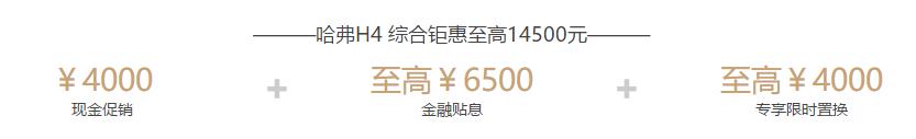 哈弗H4不僅顏值在線、動力強(qiáng)勁高效,現(xiàn)在購買還可享受由哈弗SUV官方推出的系列讓利活動,購車可享至高14500元的綜合鉅惠。