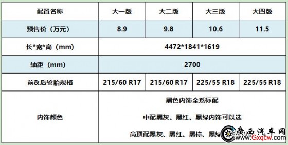新車長寬高尺寸分別為4472*1841*1619mm,軸距達(dá)到2700mm,不僅外觀更加優(yōu)雅大氣,車內(nèi)空間表現(xiàn)可圈可點(diǎn),充分滿足年輕人日常出行需求。其中大一版和大二版標(biāo)配17英寸輪轂,大三版和大四版配備了18英寸大尺寸輪轂,視覺效果更好,為用戶提供更優(yōu)質(zhì)的駕乘感受。同時在內(nèi)飾顏色上,黑色內(nèi)飾為全系標(biāo)配,中配、高配及頂配車型可選黑灰、黑紅、黑綠內(nèi)飾,高配及頂配車型增加黑棕內(nèi)飾,滿足不同用戶的審美需求。
