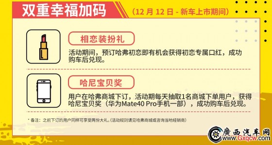 哈尼寶貝獎:用戶在哈弗商城下訂,活動期每天抽取1名商城下單用戶,獲得哈尼寶貝獎(華為Mate40 Pro手機(jī)一部),成功購車后兌現(xiàn)。
