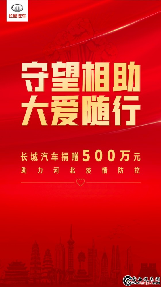 2021年新年伊始,發(fā)生在河北省石家莊市、邢臺(tái)市等地的新冠肺炎疫情,備受社會(huì)各界關(guān)注。作為從河北起步發(fā)展壯大的中國汽車領(lǐng)軍企業(yè),長城汽車始終關(guān)切著燕趙大地的發(fā)展。為助力河北省新一輪疫情防控工作,1月10日,長城汽車向河北省紅十字會(huì)捐贈(zèng)人民幣500萬元,用于購置疫情防控物資及其它醫(yī)療耗材,支援石家莊、邢臺(tái)等地疫情防控工作的開展,保護(hù)一線醫(yī)療人員及前線志愿者的防疫安全。