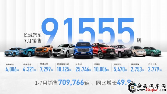 數(shù)據(jù)顯示,今年7月,長城汽車實(shí)現(xiàn)新車銷售91,555輛,同比增長16.9%,1-7月累計銷量達(dá)709,766輛,同比增長49.9%。海外市場7月銷售新車12,438輛,同比增長97.4%,1-7月累計海外銷量74,110輛,同比增長176.2%,整體銷量占比達(dá)10.4%。無論是國內(nèi)銷量,還是海外表現(xiàn),長城汽車均處于中國車企頭部陣營。