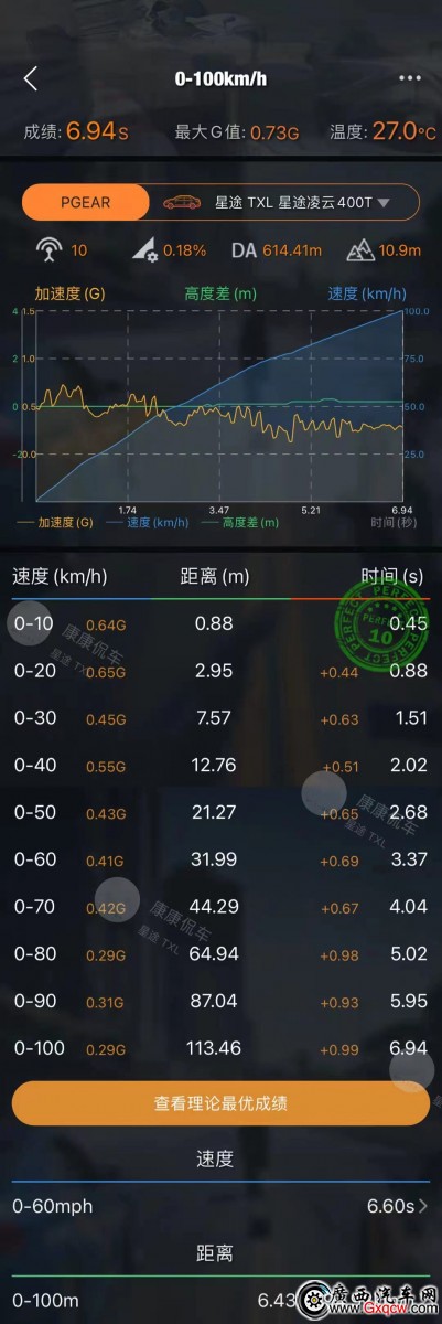 從GPS設(shè)備提供的數(shù)據(jù)來看,凌云400T的最大G值達(dá)到了0.73G,推背感明顯,0-60km/h加速僅用了3.31秒。