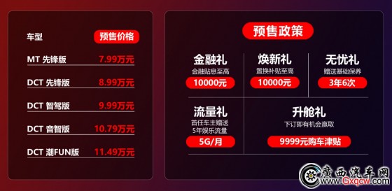此次預收發(fā)布會1.5T五款車型,MT先鋒版、DCT先鋒版、DCT智駕版、DCT音智版、DCT潮FUN版,官方指導價分別為7.99萬、8.99萬、9.99萬、10.79萬、11.49萬。