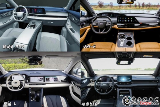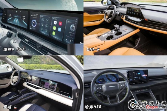 由外及內(nèi),在內(nèi)飾設計上四款車表現(xiàn)各異,從布局上來說,基本上涵蓋了主流市場的趨勢——向科技感看齊,均采用橫向環(huán)抱式設計。首先星越L采用長達1米的“貫穿式”中控屏設計,增強了不少車內(nèi)的科技感。不同于星越L,UNI-K采用的是3.5+10.25+9.2英寸TFT三聯(lián)屏高清儀表,搭配12.3英寸高清中控觸控大屏,滿滿科技感。而哈弗H6S采用的是獨立雙屏設計,視覺感稍差,但也不妨礙駕駛者的操作和體驗。