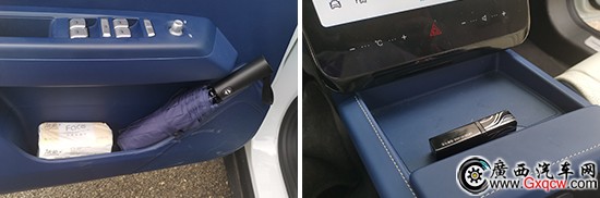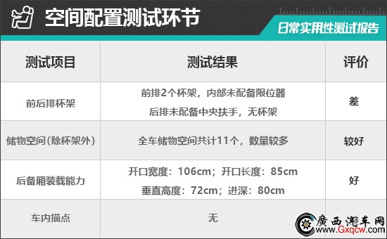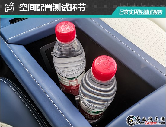 對(duì)于車內(nèi)使用空間的測(cè)試,只針對(duì)前排觸手可及的空間,不包括手套箱、中央扶手箱等需開啟的空間。測(cè)試方法是將以下固定物品全部放置在前排的各個(gè)儲(chǔ)物空間內(nèi),通過固定物品的放置情況來判斷車輛儲(chǔ)物空間的表現(xiàn)。測(cè)試選定的固定物品為:2瓶常規(guī)大小的礦泉水、1部大屏手機(jī)、1支口紅、1個(gè)挎包、1副墨鏡、1把折疊雨傘以及1包常規(guī)尺寸的抽紙。