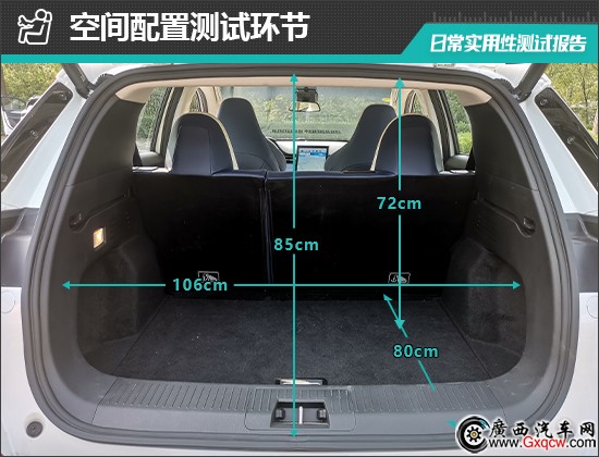 對(duì)于后備廂的基礎(chǔ)數(shù)值,我們也進(jìn)行了實(shí)測(cè),開口長(zhǎng)度為85cm;開口寬度為106cm;后備廂進(jìn)深為80cm;后備廂地臺(tái)與內(nèi)部車頂?shù)拇怪备叨葹?2cm。