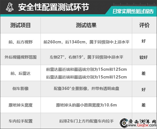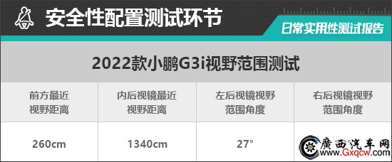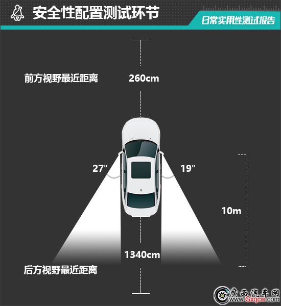 在車輛前、后方視野測(cè)試中,車內(nèi)所有座椅均已調(diào)整至最低狀態(tài),所測(cè)出的數(shù)據(jù)與駕駛者正常使用時(shí)均有一些偏差,僅供參考。