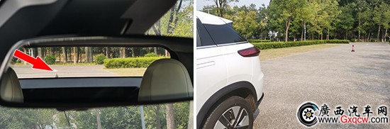 后方視野測(cè)試中,依舊將樁桶固定擺放,隨后移動(dòng)車輛直至可以觀察到樁桶上沿為止,所測(cè)得的距離為1340cm。