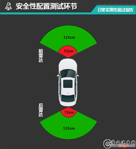 前駐車?yán)走_(dá)最遠(yuǎn)同樣可以在125cm處感應(yīng)前方物體,持續(xù)蜂鳴階段最遠(yuǎn)距離也為15cm,與后雷達(dá)保持一致。