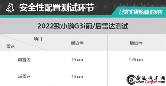 在測(cè)試過程中,倒車?yán)走_(dá)在125cm處可感應(yīng)到后方物體,雷達(dá)功率表現(xiàn)中規(guī)中矩。參考往期測(cè)試經(jīng)驗(yàn),持續(xù)蜂鳴階段越接近25cm則越貼近日常使用習(xí)慣。從實(shí)測(cè)數(shù)據(jù)來看,2022款小鵬G3i持續(xù)蜂鳴提示距離相較測(cè)試經(jīng)驗(yàn)值偏小,僅有15cm,日常使用時(shí)需多加留意。