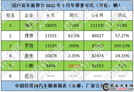 國(guó)慶假期也沒有打亂國(guó)內(nèi)造車新勢(shì)力發(fā)布“成績(jī)單”的節(jié)奏。10月第一天,5家國(guó)內(nèi)造車新勢(shì)力陸續(xù)公布9月銷量。數(shù)據(jù)顯示,9月,哪吒、理想、零跑、蔚來和小鵬的銷量分別為18005輛、11531輛、11039輛、10878輛、8468輛,同比分別增長(zhǎng)134%、62.5%、200%、2.35%、-18.7%;前三季度的累計(jì)銷量分別為111190輛、86927輛、87602輛、82434輛、98553輛,同比分別增長(zhǎng)168%、57.27%、299.33%、24.15%、75%。