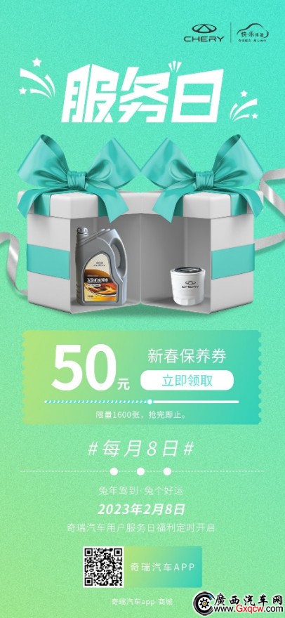 2023年2月8日起,奇瑞車主可通過奇瑞汽車APP進入活動頁面,即可在“商城”參與1積分搶“50元新春保養(yǎng)券”,共計1600張,先到先得,領到即可使用,把愛車養(yǎng)護得棒棒的,新年用車更安心!