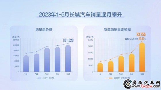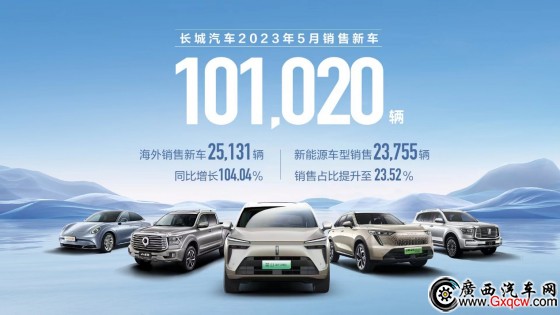 6月5日,長城汽車股份有限公司(股票代碼:601633.SH,02333.HK;以下簡稱“長城汽車”)發(fā)布2023年5月產(chǎn)銷數(shù)據(jù)。今年5月,長城汽車銷售新車101,020輛,同比增長26.18%,2023年以來銷量逐月攀升;新能源車型銷售23,755輛,銷售占比提升至23.52%,均創(chuàng)新高;海外銷售25,131輛,同比增長104.04%,創(chuàng)歷史新高,銷量占比達(dá)24.88%。