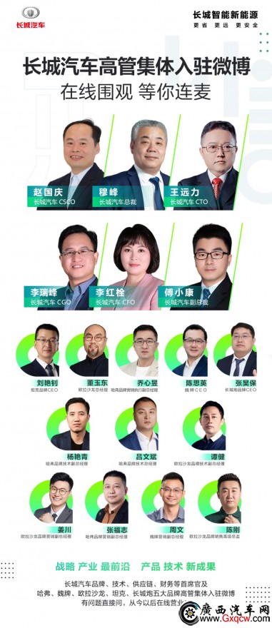 以用戶為中心,正成為長(zhǎng)城汽車發(fā)展的重中之重。為搭建與用戶雙向鏈接的新路徑,6月13日,長(zhǎng)城汽車高管團(tuán)隊(duì)集體入駐微博平臺(tái),長(zhǎng)城汽車總裁穆峰率先與微博粉絲發(fā)起親切交流,隨后首席增長(zhǎng)官(CGO)李瑞峰、首席技術(shù)官(CTO)王遠(yuǎn)力、首席供應(yīng)鏈官(CSCO)趙國(guó)慶、首席財(cái)務(wù)官(CFO)李紅栓、副總裁傅小康及五大品牌核心管理層接力互動(dòng),受到粉絲的大量關(guān)注。