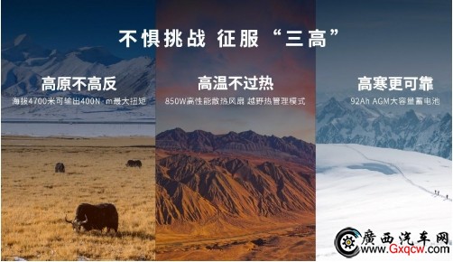2.4T越野炮不僅是一次動力升級,更是性能的全面躍升,無懼高寒、高原、高溫等極端環(huán)境。2.4T越野炮配備同級領先的AGM大容量蓄電池,容量高達92Ah,具備更高的電容穩(wěn)定性、低溫可靠性,北方寒冬冷啟動一鍵搞定;高原山區(qū)空氣稀薄動力易衰減,2.4T越野炮進行專項升級,海拔4700米高原可輸出400N·m最大扭矩,高原不高反;配備850W高性能散熱大風扇,風扇功率提升42%,匹配行業(yè)首創(chuàng)的越野熱管理模式,炎炎夏日重載長途越野奔襲也無憂。