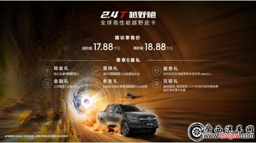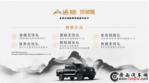 2.4T越野炮進階版官方建議零售價17.88萬元、高階版官方建議零售價18.88萬元,購車用戶還可尊享“現(xiàn)金禮、置換禮、服務禮、金融禮、老友禮、互聯(lián)禮”六重大禮;山海炮穿越版預售價24.98萬元,預訂用戶可尊享“金融禮、置換禮、老友禮、保養(yǎng)禮、網(wǎng)聯(lián)娛樂禮、救援禮”六重大禮,價值拉滿,誠意滿滿。