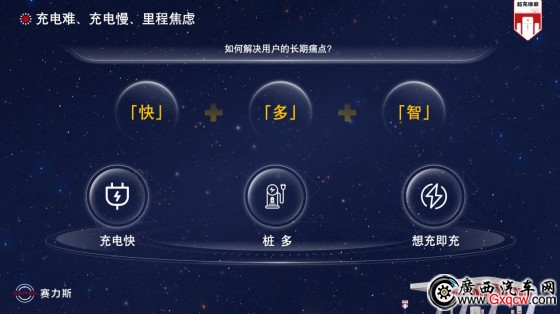 針對如何解決用戶的充電難、充電慢、里程焦慮等問題,賽力斯汽車提出了明確的解決方案——“快、多、智”。陳曉勇現(xiàn)場剖析該解決方案,并分享了賽力斯汽車所做的多項舉措。