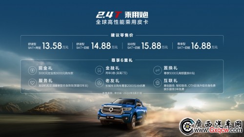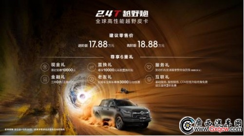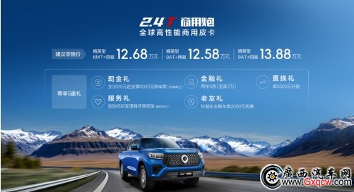近日,長城炮品類創(chuàng)新力作——全球高性能皮卡2.4T長城炮,包括2.4T越野炮、2.4T乘用炮、2.4T商用炮,三款新車均已到達(dá)各地經(jīng)銷門店全面開售。2.4T越野炮進(jìn)階版官方建議零售價(jià)17.88萬元、高階版官方建議零售價(jià)18.88萬元;2.4T乘用炮官方建議零售價(jià)13.58萬元-16.88萬元,2.4T商用炮官方建議零售價(jià)12.58萬元-13.88萬元,購車用戶還可享受現(xiàn)金禮、金融禮、置換禮、服務(wù)禮、老友禮、互聯(lián)禮(限2.4T越野炮與2.4T乘用炮)六重大禮,價(jià)值拉滿,誠意十足。