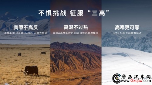 2.4T越野炮性能全面進階,輕松應(yīng)對高原、高溫、高寒等極端環(huán)境考驗。高原不高反,海拔4700米高原仍可輸出400N·m最大扭矩,高原穿越無壓力;高溫不過熱,專項配備850W高性能散熱風扇,匹配行業(yè)首創(chuàng)越野熱管理模式,炎炎夏日即使大負載長途穿越,也無需擔心;可選裝硅油風扇,實現(xiàn)發(fā)動機運行的動力最優(yōu)、油耗最優(yōu)、耐久最優(yōu);高寒更可靠,采用同級領(lǐng)先的AGM大容量蓄電池,容量高達92Ah,電容穩(wěn)定性、低溫可靠性更高,即使面對北方寒冬,冷啟動也可以一鍵搞定!