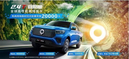 現(xiàn)在購買乘用炮、商用炮,限時(shí)綜合鉅惠至高20000元,尊享8000元現(xiàn)金禮、2000元老友禮(長城車主增購/換購及其他品牌皮卡車主換購可享)、5000元置換禮、至高7萬2年0息/4萬4年0息金融禮等政策。