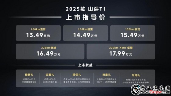 新車上市期間,用戶可以享受煥新禮、金融禮、質(zhì)保禮、流量禮、充電禮五大福利。舊車置換2025款山海T1還將享受廠補(bǔ)、國補(bǔ)雙重優(yōu)惠,國補(bǔ)換新價(jià)僅10.99萬起,廠補(bǔ)換新價(jià)12.49萬起。