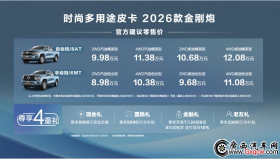 金剛炮8AT車型,官方建議零售價9.98萬元起;金剛炮6MT車型,官方建議零售價8.98萬元起。并同步推出5000元現(xiàn)金禮、5000元置換禮、2000元老友禮以及7萬24期0息金融補貼四重豪禮。
