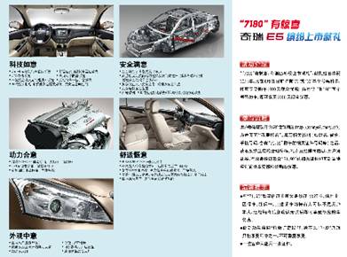 奇瑞E5擁有“科技如意、外觀中意、動(dòng)力合意、安全滿意、舒適愜意”五大核心賣點(diǎn)。科技如意:奇瑞E5裝配的CAN-BUS智能行車管家系統(tǒng)、GPS導(dǎo)航系統(tǒng)、電子防盜系統(tǒng)、一鍵啟動(dòng)(旋轉(zhuǎn)式)及無(wú)鑰匙進(jìn)入系統(tǒng)、車載數(shù)字電視、多媒體影音播放系統(tǒng)、方向盤音響控制等科技配置,盡顯科技如意,讓你的生活更加多彩繽紛。外觀中意:奇瑞E5采用了國(guó)際風(fēng)尚流線型設(shè)計(jì),鍍鉻式U型前格柵,時(shí)尚大氣,符合主流審美要求;內(nèi)置式雙層雙開啟電動(dòng)天窗,可折疊電動(dòng)外后視鏡,組合式尾燈及鷹眼透視晶鉆大燈更添運(yùn)動(dòng)感。動(dòng)力合意:奇瑞E5搭載的ACTECO十佳發(fā)動(dòng)機(jī),最大扭矩140N.M,1.8L發(fā)動(dòng)機(jī)配合CVT無(wú)極變速箱,操控更便捷。整車滿足國(guó)IV排放標(biāo)準(zhǔn),節(jié)能環(huán)保。安全滿意:奇瑞E5全金屬封閉式承載式籠形車身,高強(qiáng)度吸能防撞梁及側(cè)門防撞桿設(shè)計(jì),安全保障全面升級(jí);雙安全氣囊、緊急鎖止三點(diǎn)式安全帶、四輪碟剎、ABS +EBD等從容應(yīng)對(duì)各種突發(fā)狀況。舒適愜意:超大車身尺寸,配合內(nèi)置20余處人性化儲(chǔ)物空間及后排多變式空間組合,駕乘舒適感倍增;前后獨(dú)立懸架能輕松應(yīng)對(duì)多種路面,讓您駕乘更舒適,配以整車NVH專業(yè)調(diào)教,全方位聲學(xué)設(shè)計(jì)定義,讓您駕乘更加寧?kù)o愜意。