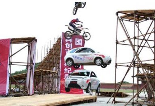 2010年,奇瑞QQ成功創(chuàng)造了“四車交叉飛躍”吉尼斯世界紀(jì)錄,這是繼去年成功挑戰(zhàn)“汽車漂移入位前后最窄距離”世界紀(jì)錄之后,第二次成功挑戰(zhàn)吉尼斯。奇瑞QQ經(jīng)得住特技表演中摸爬滾打的高難度考驗,充分說明了QQ作為中國小車的世界品質(zhì)。