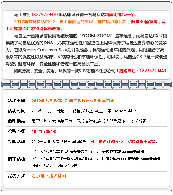 2012款馬自達(dá)CX-7 鑫廣達(dá)獨(dú)家買斷限量銷售 網(wǎng)上報(bào)名中