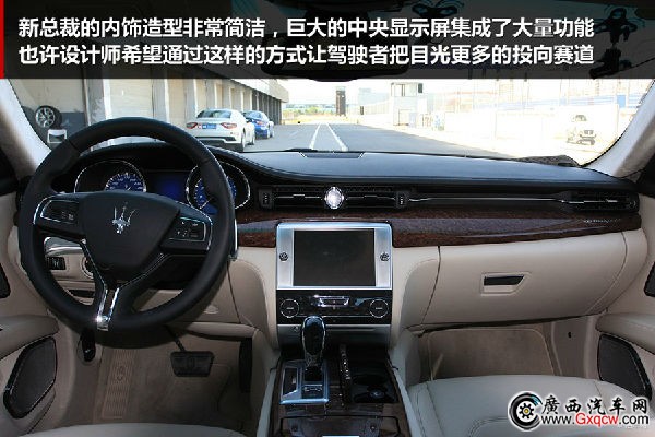 內(nèi)飾的變化也同樣翻天覆地,尤其是中控臺(tái)的控制格外簡(jiǎn)潔,大部分的功能都集成在了一個(gè)巨大的液晶顯示屏中。但由于時(shí)間比較緊張,這次試駕對(duì)中控臺(tái)的研究不多,不知道這套系統(tǒng)對(duì)于瑪莎拉蒂的潛在用戶會(huì)不會(huì)顯得過(guò)于復(fù)雜。細(xì)節(jié)處理精致,整體風(fēng)格簡(jiǎn)潔,也許新總裁的設(shè)計(jì)師希望通過(guò)這樣的方式,讓駕駛者把更多的精力投入到駕駛中,去充分感受新總裁與其它豪華品牌車型的不同。實(shí)際上今天我的注意力也確實(shí)全都投入到了享受新總裁的駕駛樂(lè)趣中。