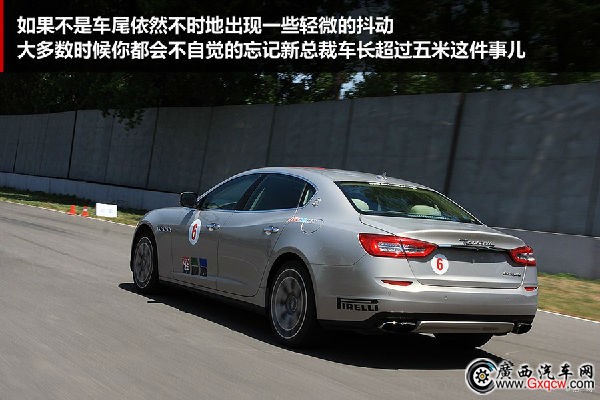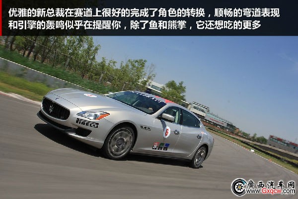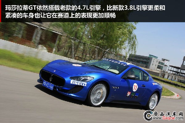 今天到場(chǎng)了除了搭載3.8升V8引擎的新總裁外,也有幾臺(tái)搭載老款4.7升引擎的GT可以試乘試駕。由于新總裁并不多,所以在短暫的試乘之后,我先被分到了GT試駕組。自然吸氣發(fā)動(dòng)機(jī)的加速感來(lái)的要柔和一些,按教練的說(shuō)法是:“那新總裁傻快傻快的”。新總裁的快我之前已經(jīng)體驗(yàn)到了,那么超過(guò)五米的車身會(huì)不會(huì)讓它在賽道上顯得有些傻呢?