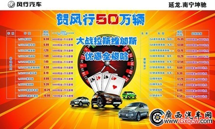 2013年南寧風(fēng)行汽車(chē)最瘋狂的年中大促來(lái)了!多款車(chē)型直降萬(wàn)元還有萬(wàn)元禮包套餐,來(lái)風(fēng)行“大戰(zhàn)拉斯維加斯,優(yōu)惠全梭哈”!最瘋狂的紅包,真正讓用戶(hù)high到爆!最給力的折扣,各車(chē)型使出價(jià)格殺手锏!還有驚爆低價(jià),讓人樂(lè)到手軟!