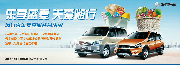 炎炎夏季,高溫、多雨、灰塵大、輻射強,容易使汽車的技術(shù)狀態(tài)發(fā)生變化,同時夏季又是汽車故障的多發(fā)季節(jié)。為了保證車主在夏季暢行無憂特此推出“樂享盛夏,關(guān)愛隨行”夏季服務(wù)月活動。2013年7月15日―2013年8月5日期間,南寧坤馳風行汽車特約服務(wù)站準備了多重惠享,期待您的到來,清涼夏日,讓您的愛車與夏天有個美麗的約會! 售后24小時服務(wù)熱線:0771-5688992
