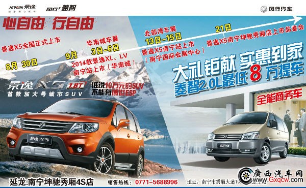 9月3日上午10:00南寧坤馳秀廂4S店將在在華南城東盟汽車展銷會(huì),舉行“經(jīng)典大兩廂 舒適新生活――2014款景逸煥新上市”活動(dòng),活動(dòng)誠(chéng)邀媒體屆朋友和風(fēng)行新老客戶參加,現(xiàn)場(chǎng)除時(shí)尚熱辣的歌舞表演以及互動(dòng)活動(dòng),還將派發(fā)多重禮品,當(dāng)天訂購(gòu)14款景逸將享多重驚喜優(yōu)惠,部分車型的優(yōu)惠高達(dá)萬元。同時(shí)性能超越同級(jí)的景逸X5也將驚艷亮相車展現(xiàn)場(chǎng)。