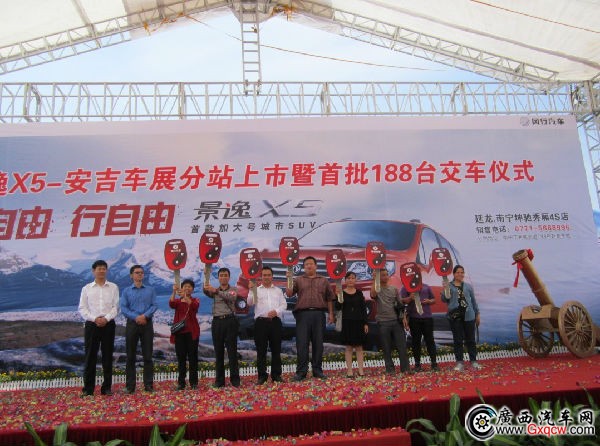 10月20日安吉車交會,南寧坤馳 “景逸X5--安吉車交會分站上市暨南寧首批188臺交車儀式”隆重舉行,本次活動是暨9月柳州200臺景逸X5交車儀式后的廣西區(qū)域景逸X5的又一盛況;顒蝇F(xiàn)場廠家代表以及經(jīng)銷商代表分批將新車鑰匙交到首批新車的車主手中,現(xiàn)場的觀眾及媒體朋友共同見證這一喜慶的一幕。