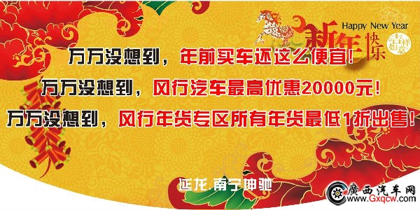 本周末18-19日,南寧坤馳風(fēng)行秀廂4S店“喜慶開(kāi)年歡聚“逸”堂——景逸迎春喜樂(lè)會(huì) ”活動(dòng),景逸1.5、景逸X5、菱智M5、風(fēng)行CM7多款車(chē)型參與活動(dòng),特價(jià)車(chē)款優(yōu)惠高達(dá)20000元,同時(shí)參加活動(dòng)買(mǎi)年貨最低1折。