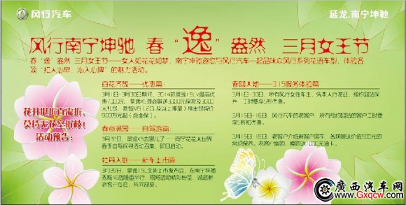 春“逸”盎然 三月女王節(jié)——女人如花花如夢,南寧坤馳邀您與風行汽車一起品味眾風行系列花語車型,體驗3月的魅力活動。南寧坤馳風行3.15服務活動誠邀您參與。