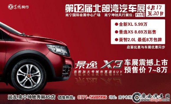 2014年4月 17日,南寧坤馳風(fēng)行秀廂4S店誠(chéng)邀各位車友共同見(jiàn)證終極SUV終極進(jìn)化史,“首款加大號(hào)寬適SUV——景逸X3南寧區(qū)域榮耀上市”發(fā)布會(huì),預(yù)售價(jià)7-8萬(wàn)元。歡迎蒞臨坤馳風(fēng)行F11展位(主舞臺(tái)左側(cè))品鑒,詳詢南寧坤馳風(fēng)行秀廂4S店電話:5688996。