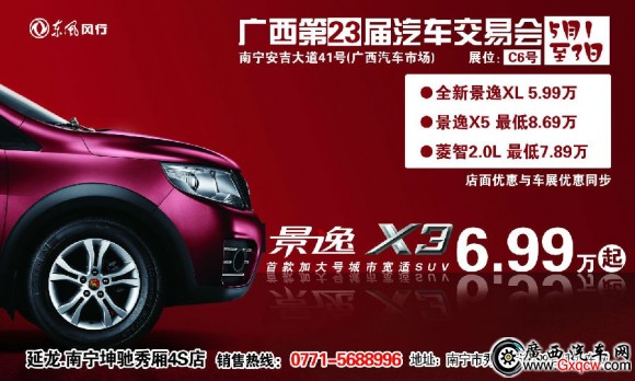 5月1日-3日,南寧坤馳4S店誠邀您參加安吉第二十三屆車交會,車展期間,我店車型綜合鉅惠,全新景逸全系5.99萬起,景逸X3 6.99萬起。以感謝長期支持和關(guān)注風(fēng)行汽車的新老客戶,現(xiàn)場將有更多優(yōu)惠,歡迎廣大客戶蒞臨安吉汽車市場南寧坤馳C6風(fēng)行展位賞車購車!詳詢南寧坤馳風(fēng)行秀廂4S店 電話:5688996。