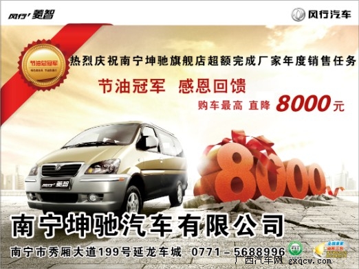 風(fēng)行汽車南寧坤馳旗艦店在2010年取得了異常豐碩的銷售業(yè)績,提前并超額完成廠家2010年銷售任務(wù)。為慶祝此振奮人心的消息,在2010年歲末,真情回報新老客戶的厚愛,菱智全系大優(yōu)惠,*高現(xiàn)金讓利達8000元。