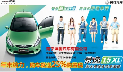 年末給力-購景逸1.5XL就送25%購置稅,風(fēng)行汽車南寧坤馳店讓你開開心心過大年,年后再提車,避免購置稅回調(diào)所帶來的額外支出。