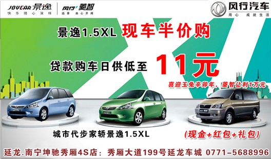 風(fēng)行汽車南寧坤馳4S店新推出購(gòu)車貸款計(jì)劃,助您提前享受美好有車生活,現(xiàn)在貸款購(gòu)車無(wú)需限制本地戶口、無(wú)需房產(chǎn)抵押、無(wú)需一次性購(gòu)買三年保險(xiǎn)、半價(jià)提車。而且時(shí)至年底,南寧坤馳特向廠家足量備貨,現(xiàn)在買車,現(xiàn)車現(xiàn)提,先到先選,詳詢5688996