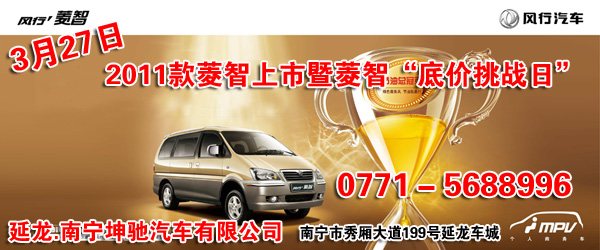 3月27日南寧坤馳——菱智2011款上市活動(dòng)暨菱智“底價(jià)挑戰(zhàn)日”2011款菱智上市將在南寧坤馳秀廂店盛大開(kāi)啟,讓利幅度絕對(duì)讓你不會(huì)后悔,即日起凡是報(bào)名參加活動(dòng)的客戶均可獲得精美禮品一份。